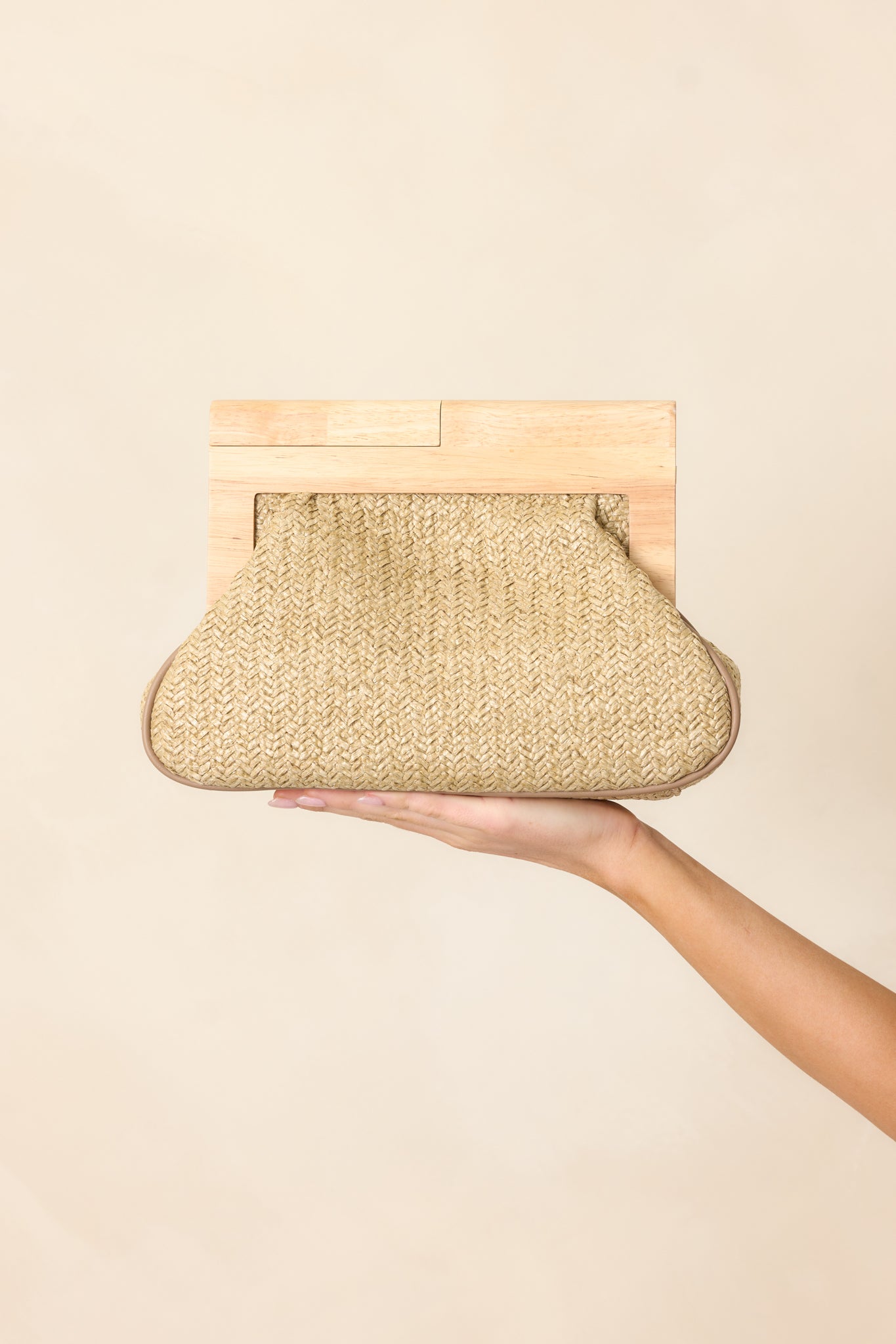A front-facing view of the natural clutch showcasing its bamboo handle, magnetic closure, and neutral tone A close-up of the bamboo handle and magnetic closure, highlighting the natural material and sleek functionality.